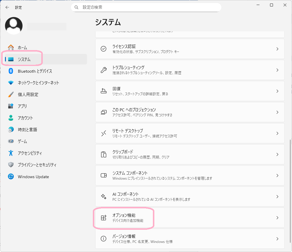 ②「システム」→「オプション機能」の順にクリックします。