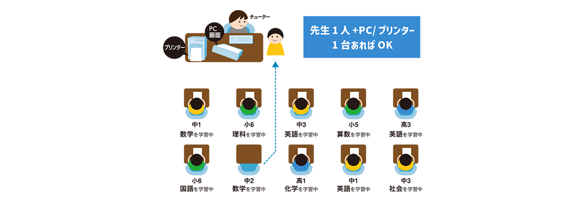 eトレは、空きコマがあればチューター1人、パソコン・プリンター1台で、簡単にコースを開始できます。