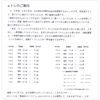 春や秋の教室だよりでeトレ講習の案内を出すときには、eトレを受講する前後の成績推移を掲載していますが、ほとんどの生徒は成績が上がっています。特に、「分からないところを解決せずにテストを迎えていた」「勉強時間が足りていなかった」という生徒は、飛躍的にアップしています。「もっと早く始めれば良かった」との声もよくいただきます。また、予習講習とeトレ講習を組み合わせることで学校の授業よりも早く学習でき、その中で苦手とするところをすぐに発見できます。分からない問題は早く質問でき、類題を何回も繰り返し取り組めるので効果は大きいです。