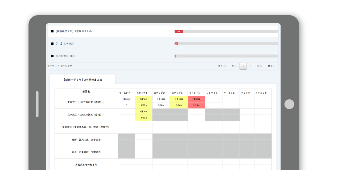 割り振られたスケジュールの達成度は1日ごとに共有されます。先生用の管理ツールからスムーズに全体把握ができるので、学習管理しやすくなります。