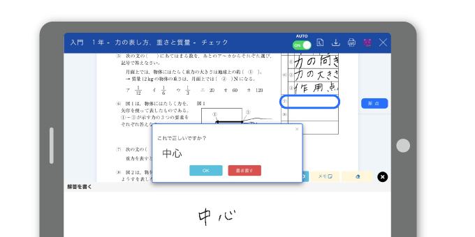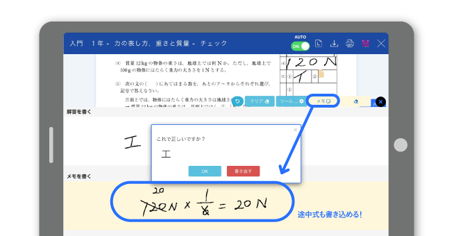 学習過程で必要なメモや途中式を記入でき、解答までの一連の流れがデバイス1つで完結します。また、自動採点後は解き直しができるなど、ノートに学習するのと同じような流れを実現しました。