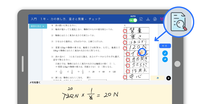 生徒がタブレット上に直接答案を書き込めるようになります。さらに、それらを読み取りブラウザ上での自動採点を実現。生徒の自立学習がよりスムーズに進みます。
